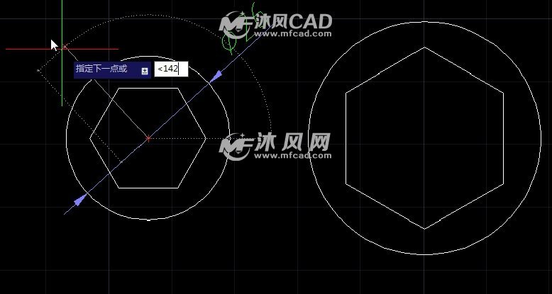 第9步:拾取旋转中心,然后拾取如图所示中点(哪一个点要与142度直线对齐就拾取哪个点)